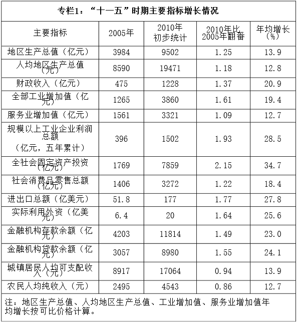 ——经济实力明显增强。经济较快增长,初步统计年均增速13.9%,增幅进入全国前列,质量效益明显提高。实现地区生产总值、人均地区生产总值、财政收入、工业增加值、服务业增加值、规模以上工业企业利润总额、全社会固定资产投资、社会消费品零售总额、进出口总额、实际利用外资、金融机构存款和贷款余额12个主要指标翻一番以上。