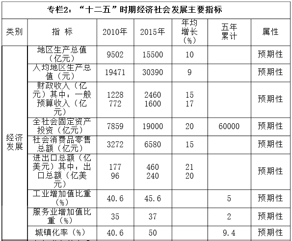 ——经济平稳较快发展。地区生产总值年均增长10%,财政收入年均增长15%,力争实现地区生产总值翻一番,财政收入、全社会固定资产投资、社会消费品零售总额、进出口总额翻一番以上。城镇新增就业190万人,城镇登记失业率控制在5%以内。价格总水平基本稳定。经济增长质量和效益明显提高。