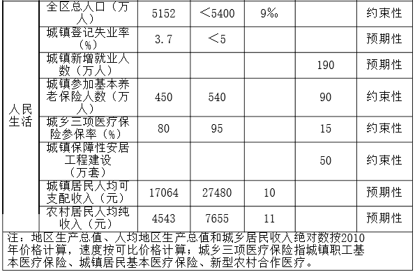 ——人民生活全面改善。全区总人口控制在5400万人以内。镇居民人均可支配收入年均增长10%,农村居民人均纯收入年均增长11%。城镇参加基本养老保险人数达到540万人,城乡三项医疗保险参保率提高到95%。城镇保障性安居工程建设50万套,中等收入群体持续扩大,贫困人口显著减少。