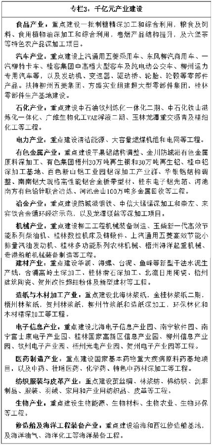 深入实施重点产业调整和振兴规划,全面落实配套政策,加大技术改造力度,淘汰落后产能,建设重大工业项目,鼓励企业在研发设计、过程控制、企业管理、营销物流、人力资源开发等环节集成应用信息技术,加快实现千亿元产业发展目标。食品产业,重点提高精深加工和综合利用水平,健全食品安全质量体系,提升全国糖业重要基地的地位。汽车产业,依托大型骨干企业,重点发展以中型轿车为主导的乘用车,巩固微型汽车在国内市场的领先优势,支持商用车扩大市场份额,形成具有较强竞争力的汽车产品体系,大力发展汽车零部件,加快建设柳州汽车城。石化产业,按照炼化一体化要求,重点发展乙烯、丙烯、芳烃等石化产品,建设全国重要的石化基地。电力产业,重点发展清洁能源,打造多元、稳定、经济、清洁、安全的现代电力产业。有色金属产业,重点延伸铝、铜、镍等产业链,实施铝电热结合,推进铜、锡、锑、钨、铅、锌、铟和稀土等精深加工,加快发展百色生态型铝、南宁和来宾铝深加工、柳州和河池有色金属新材料、防城港镍铜加工等产业,建设全国重要的有色金属产业基地。冶金产业,重点发展系列精品钢材及锰系、镍系合金等关联产品,建设全国重要的钢铁基地和锰系深加工基地。机械产业,重点发展机电一体化、数字化、智能化产品,建设区域性机械装备生产及出口基地。建材产业,重点发展太阳能光伏玻璃、优质浮法玻璃和建筑卫生陶瓷等产品,大力开发绿色环保新型建材。造纸与木材加工产业,重点发展林浆纸一体化及造纸深加工产品,积极发展环保型林化工和木材精深加工产品。电子信息产业,重点发展电子终端、软件、新型电子元器件及电子原材料等产品,建设北海、南宁、桂林、玉林、钦州等电子信息产业基地。医药制造产业,重点发展现代中药和以壮瑶药为重点的民族医药,大力发展检测、诊断、治疗等医疗器械。纺织服装与皮革产业,重点发展茧丝绸及服装系列加工和环保型制革产品,发展林浆纺一体化产业。生物产业,重点发展生物医药、生物育种、生物肥料等生物技术和产品,加快建设南宁国家高技术生物产业基地。修造船产业,重点发展船舶修造及配套产业,建设沿海和西江修造船基地。到2015年,力争食品产业年销售收入超3000亿元,汽车、石化、电力、冶金、机械、有色金属产业均超2000亿元,建材、造纸与木材加工、电子信息、生物产业均超1000亿元,医药制造、纺织服装与皮革、修造船及海洋工程装备产业均超500亿元。