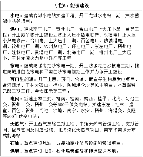 推进能源多元清洁发展,转变能源生产和利用方式,优化能源结构,构建清洁能源示范区。深度开发水电,突出抓好龙滩水电站二期建设,因地制宜发展中小型水电,合理布局抽水蓄能电站。优化发展火电,优先建设“上大压小”煤电、热电联产综合利用等项目,鼓励发展清洁高效、大容量燃煤机组,推进传统能源清洁利用。加快建设防城港核电,积极推进平南核电前期工作并适时开工。积极发展生物质能、风能、太阳能、地热能、潮汐能等可再生能源。稳步推进沿海液化天然气利用、非粮乙醇、生物柴油、生物质成型燃料、生物质气化等项目建设,开展分布式能源和太阳能城市试点,配套建设电动汽车充电设施,提高可再生能源在能源消费中的比重。加强对外能源合作,积极利用云南水电资源,扩大与贵州煤电联营合作,参与东盟国家能源项目勘察设计、工程建设,大力引进国内外煤炭、油、气资源,提高能源供给保障能力。加快建设沿海原油、成品油商业储备设施和煤炭储备及转运配送基地。建设适应负荷发展需要和区内外电力接入的主网架,完善受端电网结构,鼓励在用电负荷集中的地区整合输配电资源,组建股份制区域电网,提高供电安全性和可靠性。加强城市电网完善和县级电网升级改造,重点建设南宁、柳州、桂林、梧州和沿海城市电网,积极发展智能电网。加快实施原油、成品油管道和天然气主干管网、支线管网、配气管网及附属设施工程。到2015年,力争电力装机容量达到4100万千瓦,其中水电1600万千瓦;建成500千伏变电站27座,220千伏公用变电站169座;设区城市天然气管网覆盖率达到70%,具备条件的县城管网覆盖率达到60%。