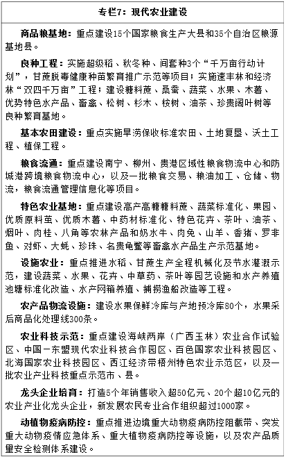 加快转变农业发展方式,建立健全现代农业产业体系,大力发展高产、优质、高效、生态、安全农业,促进农业生产经营专业化、标准化、规模化、集约化,提高农业综合生产能力、抗风险能力和市场竞争能力。把增强粮食安全保障能力作为重要任务,实施新增粮食生产能力规划,优化粮食品种结构,加快超级稻、优质稻等良种选育推广,严格保护耕地,加强农村土地整理复垦,重点搞好以农田水利设施为基础的田间工程建设,大规模改造中低产田,把产粮大县的基本农田尽快建成旱涝保收的高标准农田,发展一批水稻、玉米和冬种马铃薯等优势产区,建设50个商品粮生产基地县,粮食播种面积稳定在4600万亩以上,粮食综合生产能力达到1500万吨以上。完善粮食生产流通扶持政策,加强粮油加工、物流、储备和应急保障能力建设,完善粮食市场调控体系。优化农产品结构,大力开发特色优势农产品,扩大健康种苗种植面积,鼓励和支持优势产区集中发展粮食、甘蔗、桑蚕、油料等大宗农产品,引导稳定糖料蔗种植面积,重点建设城市郊区蔬菜生产基地和右江河谷、湘桂通道等南菜北运蔬菜基地,推进蔬菜、水果、花卉、中草药、茶叶等园艺产品设施化生产。提高生猪、家禽和草食畜禽发展水平,促进特色名贵海淡水产品健康养殖,实施养殖池塘标准化改造工程。大力发展林业产业。加强农产品品牌培育,重视农产品原产地地理标识认证,强化特色优势农产品在全国中心城市的宣传、展示和促销,完善多种形式的农产品市场营销网络。推进农业产业化经营,建设重点龙头企业梯队,突出发展农产品深加工和流通,加强农产品批发市场和冷链物流设施建设。加快把蚕茧、草食动物、奶水牛、中药材、非粮生物质能原料、优势水产品、油茶、花卉培育为产值超100亿元,粮食、蔬菜、水果培育为超500亿元,糖料蔗、畜禽、速丰林培育为超1000亿元的强优农产品产业。强化生产、储运、销售等环节全程监管,提高农产品质量安全水平。加强现代种业、高效栽培、疫病防控、农业节水等科技创新,建设农业科技重点示范县,增强现代农业示范区示范功能。健全农业科技成果转化、技术推广、动植物疫病防控等农业公共服务体系,继续开展农村科技特派员行动。推进农业机械化和农业生产经营信息化。培育多元化农村社会化服务组织,支持供销合作社、邮政服务“三农”网络配送中心、农民专业合作组织、农民经纪人、龙头企业等提供多种形式的生产经营服务。拓宽政策性农业保险覆盖区域和试点品种,完善农业生产灾害补偿机制。