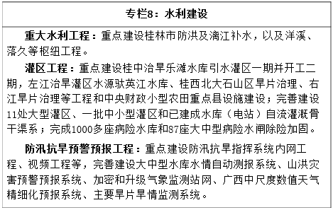 坚持兴利除害结合、防灾减灾并重、治标治本兼顾、政府社会协同,加强水利设施建设,进一步提高水利保障能力。推进西江、郁江、柳江、桂江、钦江、南流江等重要江河干支流及中小河流治理,重点建设桂林市防洪及漓江补水、洋溪、落久等控制性水利枢纽工程,构建重要堤库结合的防洪抗旱减灾体系。大力支持小型农田重点县设施建设。实施沿海海堤达标和重要河口综合治理工程。加快推进病险水库除险加固和大中型病险水闸除险加固,消除安全隐患。搞好跨界河流国土防护治理。重点推进桂中和左右江等治旱骨干工程建设、桂西大石山区旱片治理,以及大中型灌区配套续建和节水改造,新增有效灌溉面积180万亩。加快建设山区“五小水利”工程。加强防汛抗旱预警预报信息化系统和基层防汛体系建设,提高防汛抗旱应急处置能力。