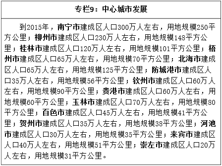 实施中心城市带动战略,以城市产业园区建设带动城市新区发展,完善大型综合商业区布局,发展商务经济,促进产业与城市发展相融合,优化城市规划,美化人居环境,增强经济实力、文化实力、综合服务能力,发挥中心城市以工促农、以城带乡的核心带动作用。突出发展南宁、柳州超大城市和桂林特大城市,成为推动城镇化跨越发展的重要引擎。南宁市按照建设区域性国际城市的定位,加快向五象新区拓展,完善江北,提升江南,重点建设五象核心区文化城、体育城、总部基地、保税物流、金融集中区和空港新城、五合大学城,推进邕宁枢纽前期工作,加快生态水城建设,成为广西“首善之区”,力争建成区人口达到300万人左右。柳州市按照建设现代工业名城的定位,重点建设柳东新区汽车城,提升完善河西工业区,整合优化柳北工业区,推进洛维工业集中区,打造西江经济带龙头城市,力争建成区人口达到230万人左右。桂林市按照建设国际旅游名城的定位,保护开发漓江山水,保护传承历史文化遗产,重点拓展临桂新区,加快建设雁山科教园区和苏桥产业新城,打造国际旅游重要目的地,力争建成区人口达到120万人左右。做大做强其他区域性中心城市,完善新建城市基础设施,壮大产业经济,增加城市人口,扩大城市规模,完善城市功能,着力建设富有特色、独具魅力的现代化城市。