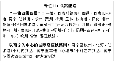 加快发展高速铁路,提高技术等级,扩大路网覆盖,增加铁路网密度,逐步形成以南宁为主枢纽的快速客运网和大能力货运网。在“北上、南下、东靠、西进”四个方向上加大力度,加快对接先进生产力地区,建设通往珠三角经济发达地区和西北、华北、西南地区的大能力快速铁路通道,连接北部湾地区的沿海铁路通道及周边国家的国际铁路通道。重点建设省际干线、客运专线、煤运通道和开发性新线,加快既有线路扩能和复线建设,提高电气化水平,改造和新建一批铁路运输枢纽。建成南宁至广州,贵阳至广州(广西段),南宁至柳州,柳州至桂林,南宁至昆明(新线),南宁至钦州、北海、防城港等在建项目;新建黄桶至百色、南宁至凭祥、合浦至湛江、河池至南宁、柳州经梧州至肇庆、贵港至玉林、柳州经贺州至韶关、防城港至东兴、靖西至龙邦等铁路;实施湘桂线、黔桂线、焦柳线、黎湛线、南昆线、洛湛线等既有线路扩能改造,规划建设项目38项(其中在建项目21项),建设规模5000公里(其中续建2500公里),实现北京至南宁全程高速铁路贯通运行。推进南宁枢纽、柳州枢纽、桂林北站、梧州南站,以及南宁、柳州、北部湾集装箱办理站建设。规划研究南宁至新加坡通道凭祥至河内段,贵阳经河池至南宁,张家界经桂林、玉林至海口等铁路项目及既有线路电气化改造。到2015年,铁路营运里程达到5000公里以上,铁路网密度每万平方公里210公里,复线率55%,电气化率70%以上,形成以南宁为中心的城际高速铁路网,实现地级市开通城际高速列车,基本建成“一轴四纵四横”现代化快速铁路运输网络,全面进入高铁时代。