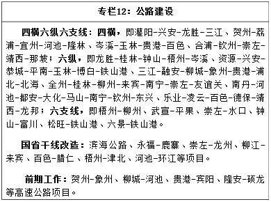 加快推进国家和地方高速公路网规划项目建设,重点实施出省出边出海通道工程和国省干线公路改造工程,大幅提高公路网密度和通达深度。建成六寨至河池、河池至宜州、河池至都安、岑溪至水汶、钦州至崇左、玉林至铁山港、六景至钦州港、百色至靖西、南宁外环、防城港至东兴等高速公路及沿海高速公路改扩建工程,开工河池至百色、崇左至靖西、梧州至柳州等高速公路,建设项目43项(其中在建项目24项),建设里程4660公里(其中续建里程2600公里)。推进南宁东站(凤岭)及柳州飞鹅、梧州玫瑰湖等综合客运枢纽站建设。加快滨海公路等国省干线改造,贯通省际公路通道。到2015年,力争公路总里程超过11.5万公里,公路网密度每百平方公里48.5公里,其中高速公路新增3500公里,通车里程6000公里以上,基本建成“四横六纵六支线”高速公路网,实现高速公路网覆盖所有中心城市,85%以上的县城半小时内通达高速公路,为到2020年高速公路通车里程达到8000公里、实现县县通高速公路打下坚实基础。