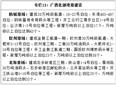 以提高广西北部湾港现代化国际化水平为目标,重点实施港口工程、集疏运工程、港航服务工程,深化港口开放合作,努力建成区域性国际航运中心。大力推进深水航道、专业化大能力泊位及集装箱码头建设,大幅提高港口吞吐能力,到2015年,力争广西北部湾港新增吞吐能力2.15亿吨,总吞吐能力达到3.36亿吨以上,其中集装箱吞吐能力400万标箱;防城港域新增吞吐能力8100万吨,总吞吐能力达到1.32亿吨;钦州港域新增吞吐能力6500万吨,总吞吐能力达到1.08亿吨;北海港域新增吞吐能力7000万吨,总吞吐能力达到0.96亿吨。推进海运、公路、铁路和管道等多式联运的集疏运系统建设,完善石油、煤炭、矿石、粮食等大宗货物和集装箱国内外中转运输体系。加强港口通信、生产调度、安全保障、导航监管、海事海关、检验检疫等系统建设,健全港航服务保障体系。大力引进国内外大型港航企业,自主建设和经营港口码头、航运航班、物流运输,增开海运航线航班,扩大港口吞吐量,提升港口竞争力。拓展港口腹地,建设“无水港”。整合港口和航运行政管理资源,建立高效统一的新型港口管理体制。