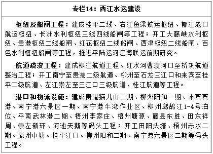 加快西江干流、重要支流航道整治,构建高等级航道网体系,完善港口布局和集疏运网络,推进运输船舶标准化大型化,形成畅通高效、平安绿色、江海联运的西江黄金水道。重点实施航运枢纽及船闸、航道疏浚、港口和物流设施、运力优化、支持保障系统五大工程,建设完善水路、铁路、公路相互衔接、转运便利的多式联运体系,全面提升航道等级、船闸通过能力和港口吞吐能力。到2015年,力争内河港口吞吐能力达到1.5亿吨,其中贵港、梧州和南宁综合港吞吐能力分别为7200万吨、2100万吨和2000万吨,百色、柳州、来宾和崇左港吞吐能力分别为1200万吨、1100万吨、1100万吨和280万吨。