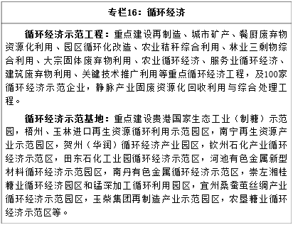以提高资源产出效率为目标,加强规划指导、财税金融等政策支持,推进生产、流通、消费各环节循环经济发展,加快构建覆盖全社会的源循环利用体系。重点在制糖、铝业、钢铁、锰业、石化、电力、建材、林浆纸、林产加工、化工等行业构建循环利用产业体系,鼓励企业建立循环经济联合体,推动产业循环式组合,建成糖业循环经济示范省区。引导企业实施环境管理标准,全面推行清洁生产。开展重点产业园区能源资源循环化改造,实现土地集约利用、废物交换利用、能量梯级利用、废水循环利用和污染物集中处理。加强共伴生矿产及尾矿综合利用,推进大宗工业固体、建筑和道路、农林等废弃物综合利用,工业固体废弃物综合利用率达到70%。完善再生资源回收体系和垃圾分类回收制度,推进再生资源规模化、产业化利用,发展再制造产业。大力推广生态循环农业模式,发展生态循环型农业。