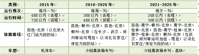 北上冷链物流货源。广西“南菜北运”货源充足,以百色为例,每年销往北京及周边地区的新鲜农产品总量大约55万吨。其中,圣女果货源15万吨、集中在每年11月初至次年4月底;芒果货源8万吨、时间为每年5-7月底;香蕉、龙眼及越南进口火龙果、毛荔枝等产品货源达到40万吨、时间为8-10月;加上来自南宁、钦州、北海、玉林等地区的香蕉、芒果、荔枝、龙眼、豆角、辣椒、淮山、香葱等货源超过50万吨。对以上/span>150万吨农产品的三分之一货源通过冷链运输、每节载货量28吨、每次列车编组28节、按全年365 天计算,每天可发1列冷藏专列。 南下冷链物流货源。每年从北京、郑州销往广西或途经广西出口东盟国家的梨、苹果、桃、葡萄、特色蔬菜、甜玉米等农产品有10万吨,内蒙古牛羊肉、山东肉制品、河北与北京等地的肉类、乳品等冷冻食品8万吨,新疆、甘肃、陕西等省区生产经郑州中转广西的马铃薯、大蒜头、洋葱、生姜、绿豆、苹果、雪梨等农产品每年总量超过25万吨,合计约43万吨,南下冷链货源相对不足,但这些南下冷链货源在湖南、湖北等地通过沿途合作的模式进一步补充货源,足够保证每天1专列返程的货源需求。 |