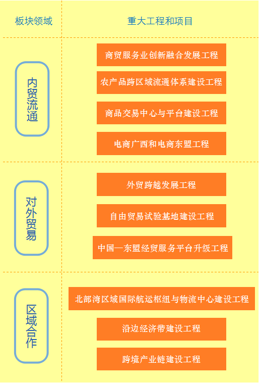 根据“十三五”时期广西经济社会发展总体思路,围绕商务发展方向、目标和任务,按照规模、影响、先进性与公益性等标准,合理遴选、设计与实施若干重大工程与项目,其主体是涵盖内贸流通、对外贸易、区域经济合作的十大商务重点工程。