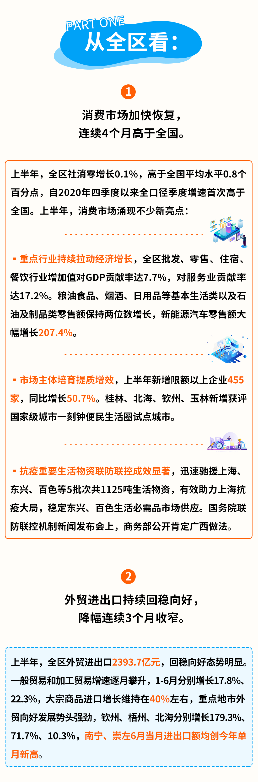 今年以来,全区商务系统按照党中央“疫情要防住、经济要稳住、发展要安全”的重要要求,全面贯彻落实自治区“稳中求进攻坚年”、早抓快干一季度、紧抓实干二季度的部署安排,充分发挥“稳消费拓市场攻坚战”和“稳外贸扩开放攻坚战”两个指挥部办公室牵头抓总作用,全力以赴促消费、稳外贸、稳外资、扩开放,上半年主要指标持续改善逆势上行。