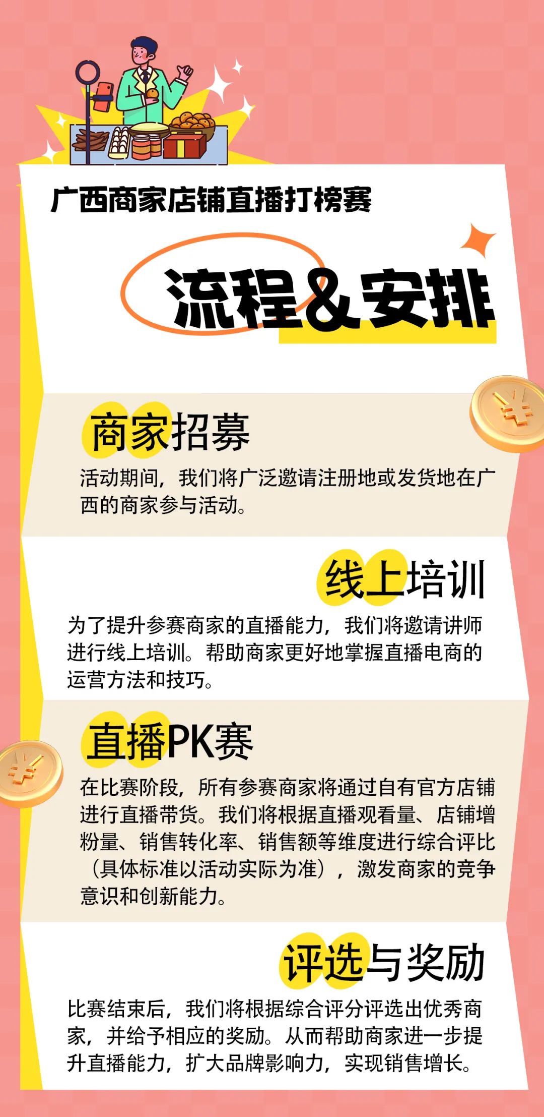 活动方式:采用“赛训结合”的方式,开展电商培训、直播PK赛,提升商家的直播能力,培养优秀的直播人才、直播商家。