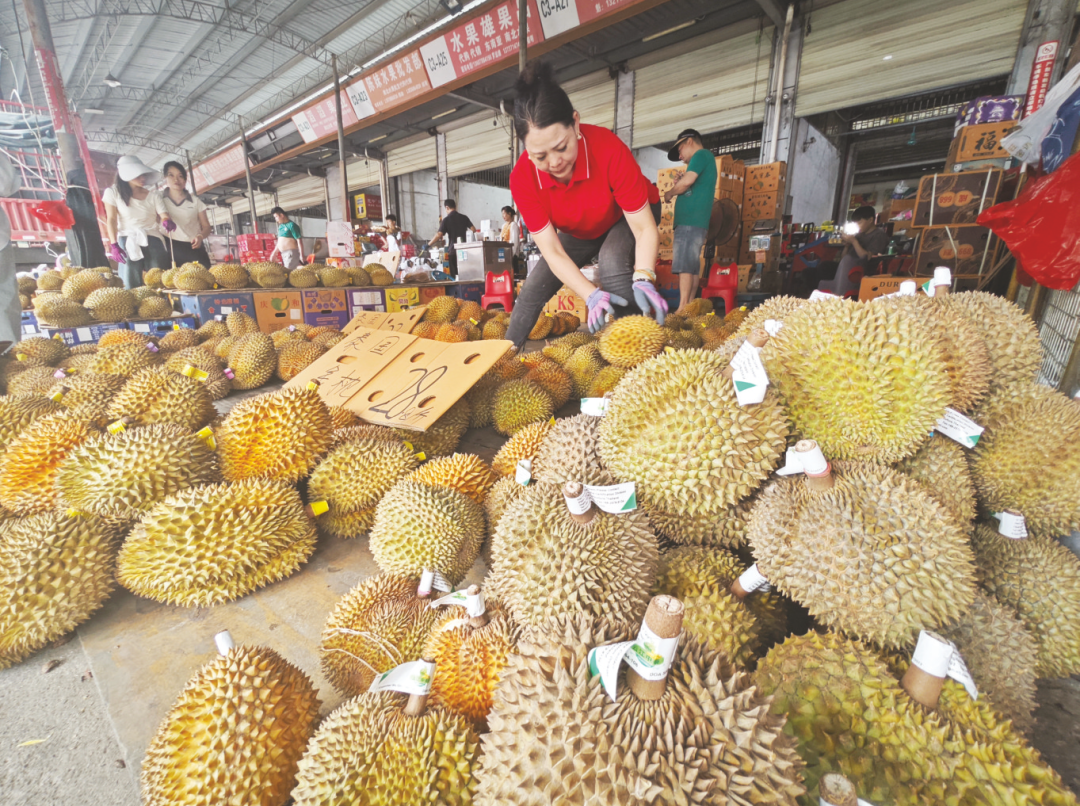 产自东盟国家的榴莲通过冷链物流车运抵市场,引来市民选购。记者梁枫摄。