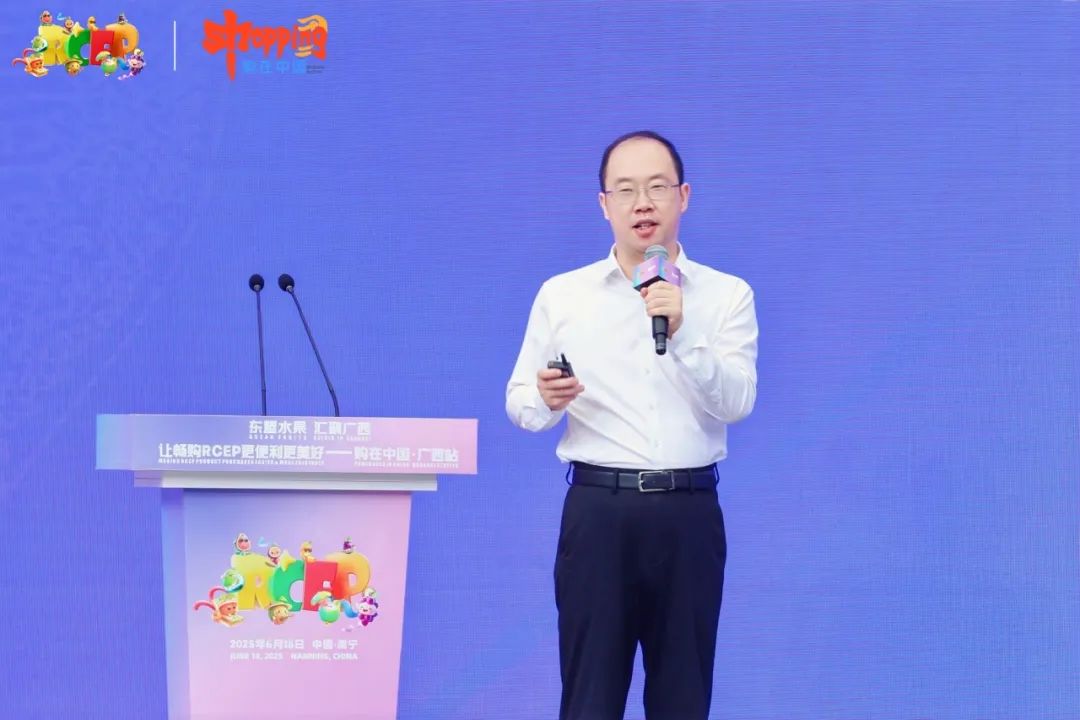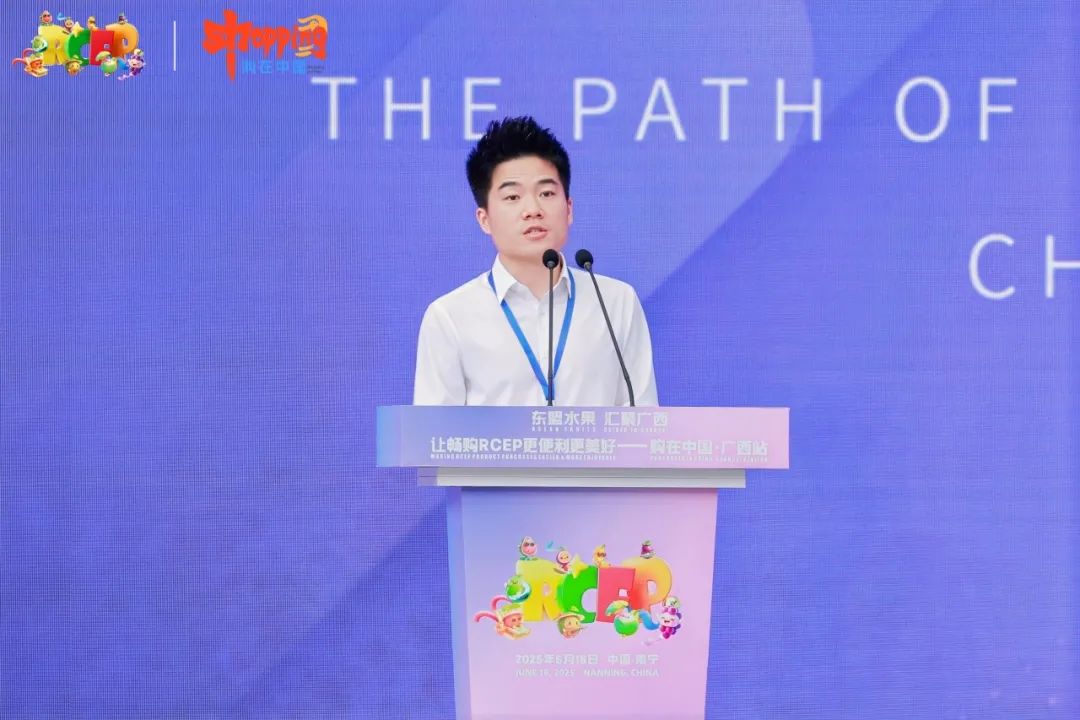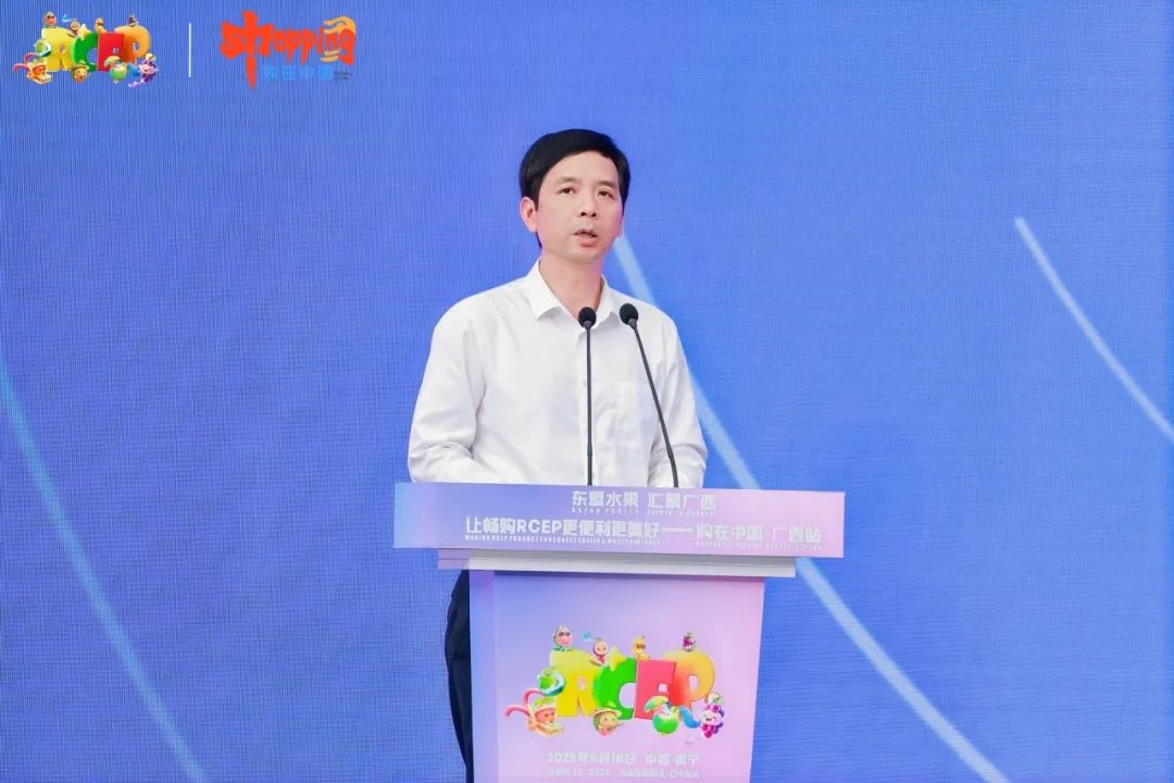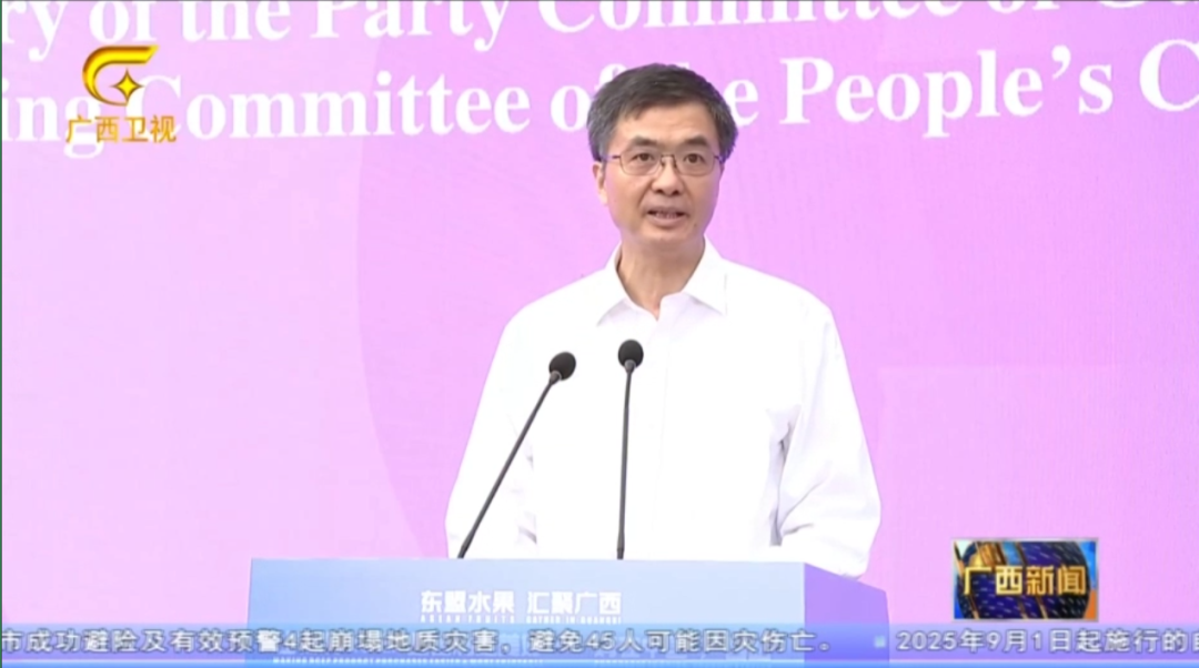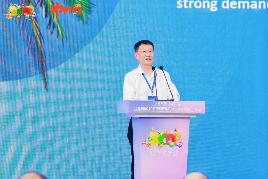 ▲陈刚表示,广西是中国面向东盟开放合作的前沿和窗口,也是全国水果产量第一的省区和东盟水果进入中国的“门户枢纽”,号称全国的“果盘子”。举办此次活动,是落实习近平主席今年4月对有关东盟国家进行国事访问成果,发挥广西作为东盟水果及RCEP优品进入中国市场的首站及枢纽作用,推动实现“东盟出产—广西集散—中国畅销”,助力深化拓展文旅推介、跨境电商等领域合作,加快区域经济一体化,服务构建更为紧密的中国—东盟命运共同体。广西期盼与各方携手,深化与东盟各国的水果经贸合作,推进基础设施互联互通,打造高效便利的进出口通关服务体系,共同开拓中国—东盟水果贸易市场空间;深化人工智能、数字经济领域交流合作,推动人工智能在水果品种研发、种植等环节的运用,打造更多人工智能垂直应用场景,共同构建面向东盟的人工智能国际合作高地;持续扩大对内对外开放,统筹推进沿边临港产业园区、钦防产业协作园区和中国—东盟产业合作区建设,进一步深化拓展各领域务实合作,共同打造安全稳定的跨境产业链供应链。让我们携手并肩,以本次活动为契机,把握时代机遇,将今日枝头的鲜甜,酿成明日共赢的琼浆,让“水果自由”的幸福感拉满千家万户,共同书写RCEP合作新篇章。