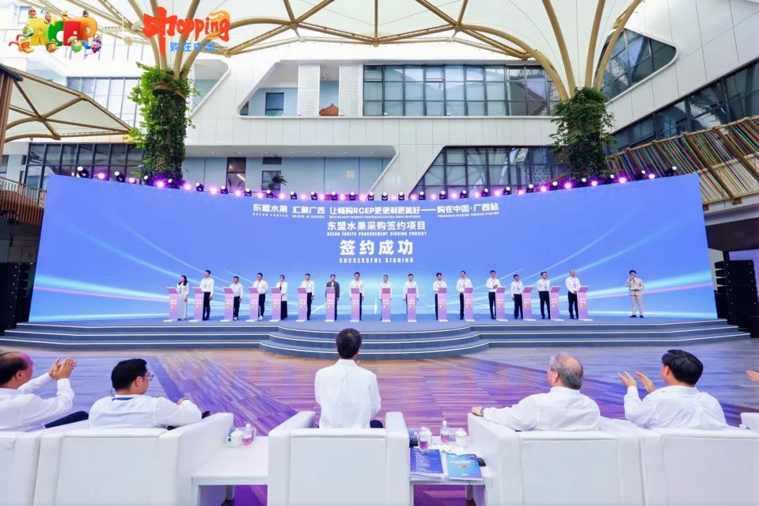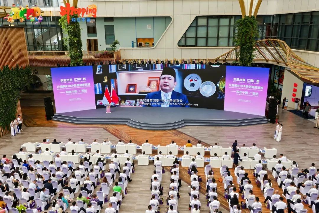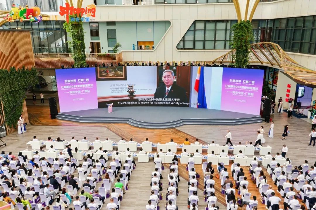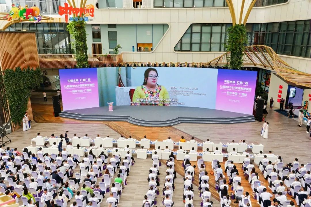 ▲陈刚表示,广西是中国面向东盟开放合作的前沿和窗口,也是全国水果产量第一的省区和东盟水果进入中国的“门户枢纽”,号称全国的“果盘子”。举办此次活动,是落实习近平主席今年4月对有关东盟国家进行国事访问成果,发挥广西作为东盟水果及RCEP优品进入中国市场的首站及枢纽作用,推动实现“东盟出产—广西集散—中国畅销”,助力深化拓展文旅推介、跨境电商等领域合作,加快区域经济一体化,服务构建更为紧密的中国—东盟命运共同体。广西期盼与各方携手,深化与东盟各国的水果经贸合作,推进基础设施互联互通,打造高效便利的进出口通关服务体系,共同开拓中国—东盟水果贸易市场空间;深化人工智能、数字经济领域交流合作,推动人工智能在水果品种研发、种植等环节的运用,打造更多人工智能垂直应用场景,共同构建面向东盟的人工智能国际合作高地;持续扩大对内对外开放,统筹推进沿边临港产业园区、钦防产业协作园区和中国—东盟产业合作区建设,进一步深化拓展各领域务实合作,共同打造安全稳定的跨境产业链供应链。让我们携手并肩,以本次活动为契机,把握时代机遇,将今日枝头的鲜甜,酿成明日共赢的琼浆,让“水果自由”的幸福感拉满千家万户,共同书写RCEP合作新篇章。