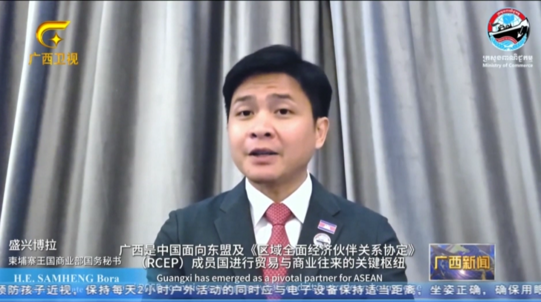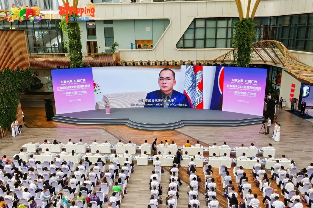 ▲盛兴博拉表示,广西是中国面向东盟及RCEP国家进行贸易与商业往来的关键枢纽。这片区域正成为包括水果在内经济贸易的繁忙中心,各类水果在此汇聚流通,连接各国市场,并推动区域经济繁荣。随着柬埔寨与中国即将在近期内敲定并完成榴莲进口议定书的相关手续,两国双边贸易将继续保持增长态势。期盼大家以友谊为基石、以共同愿景为指引,共筑繁荣未来。