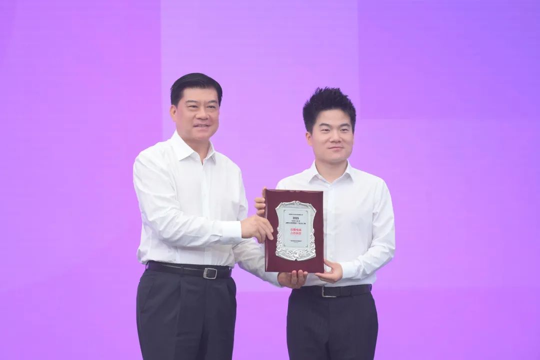 ▲广西壮族自治区商务厅厅长杨春庭向与辉同行(北京)科技有限公司授予本次活动直播电商合作伙伴牌匾。