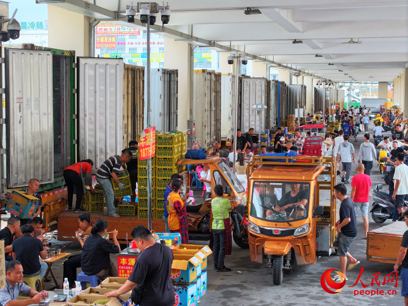 ▲南宁海吉星水果批发市场东盟水果交易繁忙。人民网 付华周摄