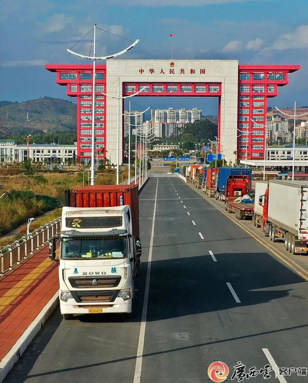 货车有序进出东兴口岸二桥国门楼。周军 摄
