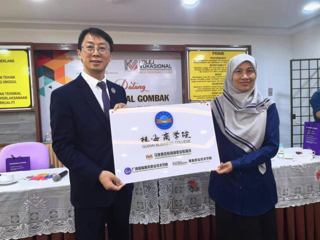 ↑学校重点打造的境外办学品牌桂海商学院—马来西亚分校在马来西亚娥麦职业学院举行挂牌仪式。