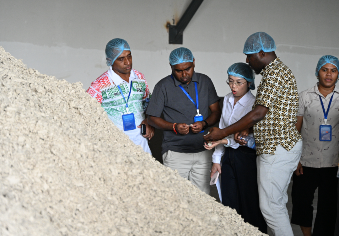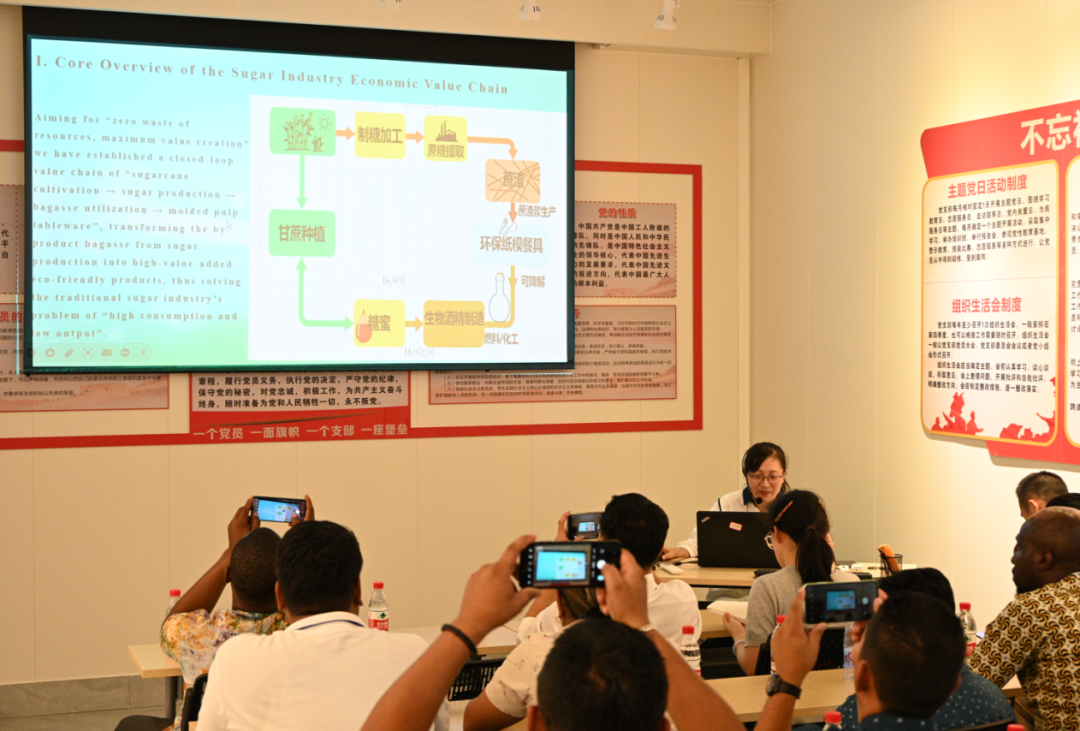 ↑广西国际商务职业技术学院承办“发展中国家糖业循环经济应用技术研修班”,图为援外培训学员到广西侨旺纸膜制品股份有限公司学习。