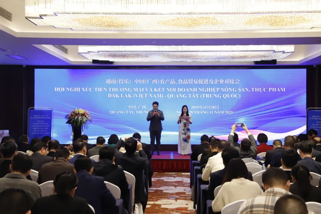 恰逢中越建交75周年暨“中越人文交流年”的重要节点,“越南(得乐)-中国(广西)农产品、食品贸易促进及企业对接会”今日在桂顺利召开。80余家两国企业齐聚一堂,涵盖农产品进出口、燕窝贸易、食品加工、航运物流等多个领域,以“农”为媒深化务实合作,共绘桂越互利共赢新蓝图。