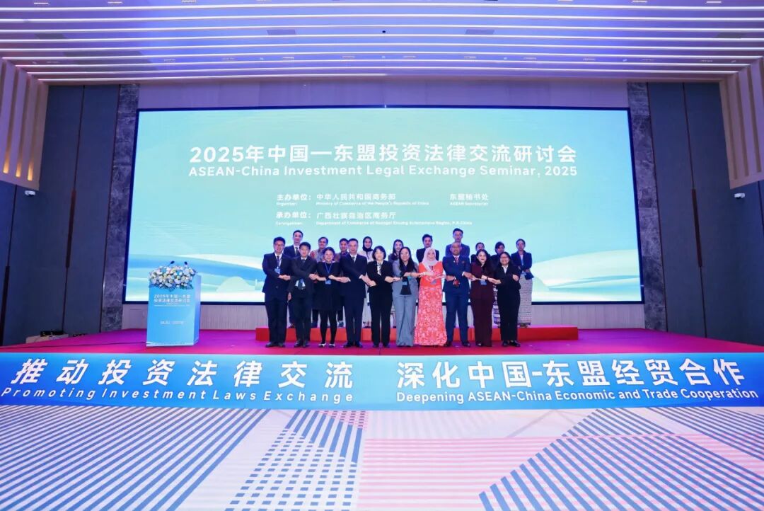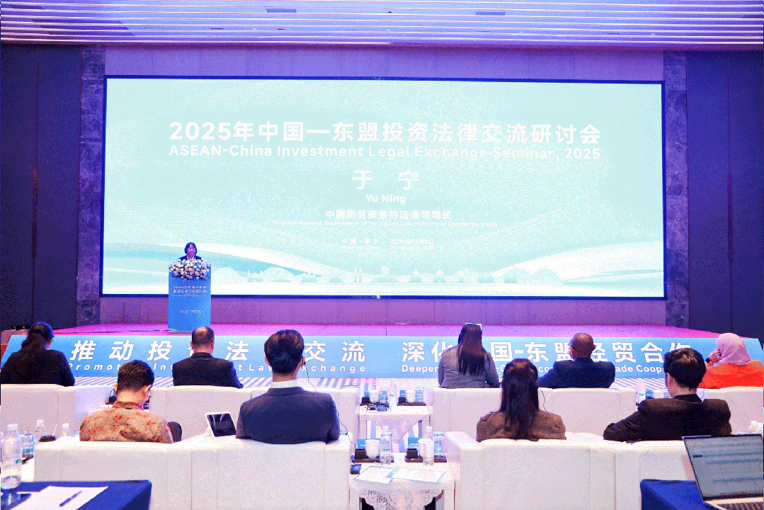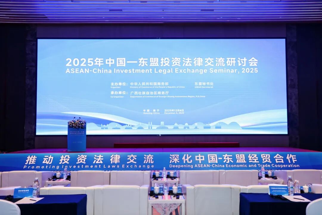 为落实2023年中国—东盟(10+1)领导人峰会共识,推动双方经贸法律合作常态化、机制化,2025年中国—东盟投资法律交流研讨会于2025年12月4日在广西南宁成功举办。研讨会由中国商务部、东盟秘书处共同主办,广西壮族自治区商务厅承办,以“促进投资法律交流,深化中国—东盟经贸合作”为主题,为中国和东盟各国政府、企业及法律界搭建高层次对话平台,共同探讨投资领域法律议题,提升区域法律合作水平,促进双向交流投资,展现中国及广西制度型开放成果。