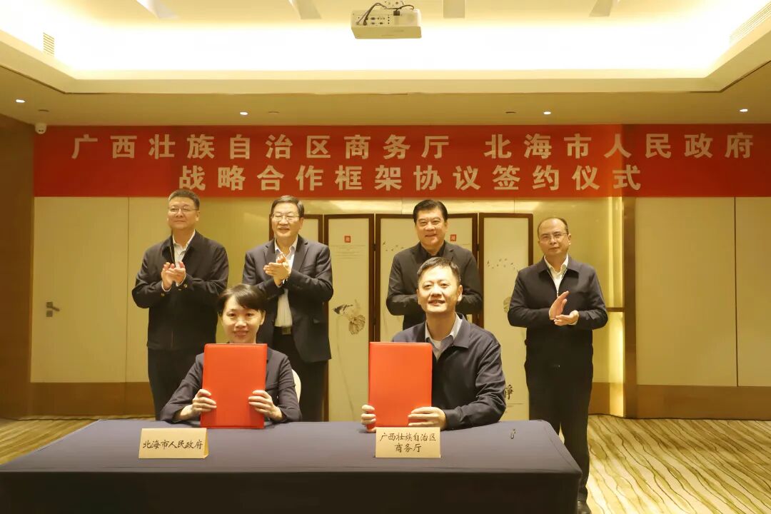 12月8日,自治区商务厅与北海市人民政府签订战略合作框架协议,北海市委书记蔡锦军,市委副书记、市长李刚会见自治区商务厅党组书记、厅长杨春庭一行并共同见证签约。自治区商务厅党组成员、驻厅纪检组组长刘柏,自治区商务厅一级巡视员粟坚参加。