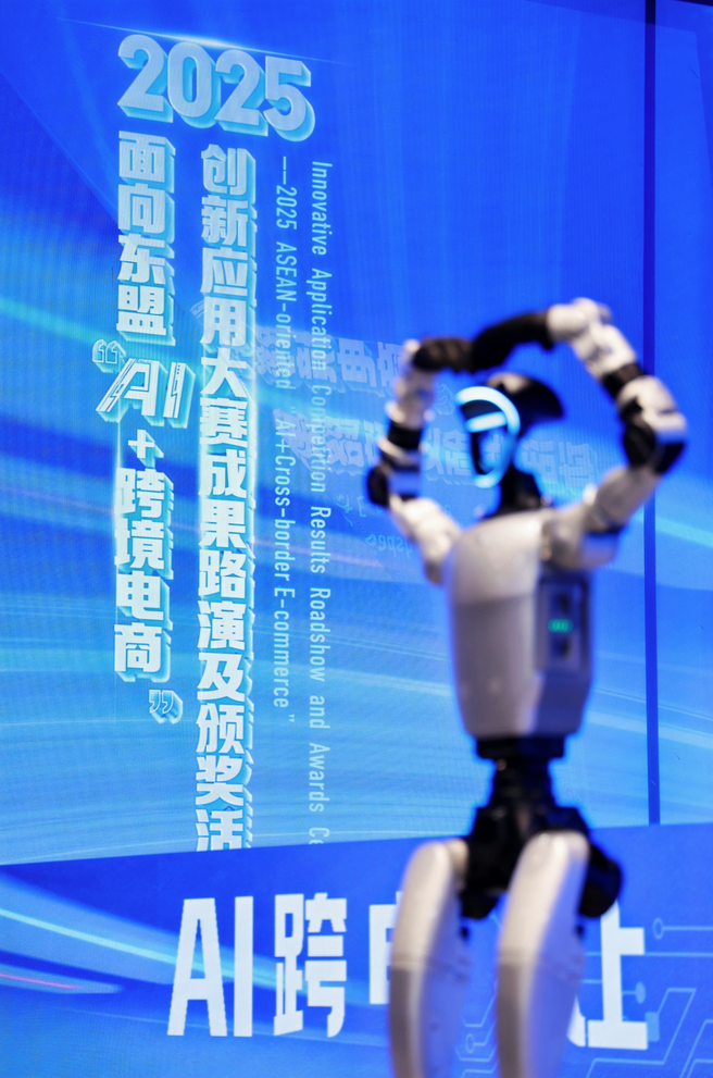 我们发布《中国(广西)自由贸易试验区数据出境管理清单(负面清单)(2025版)》、“中国—东盟AI星座”等,举办“AI+跨境电商”创新应用大赛。