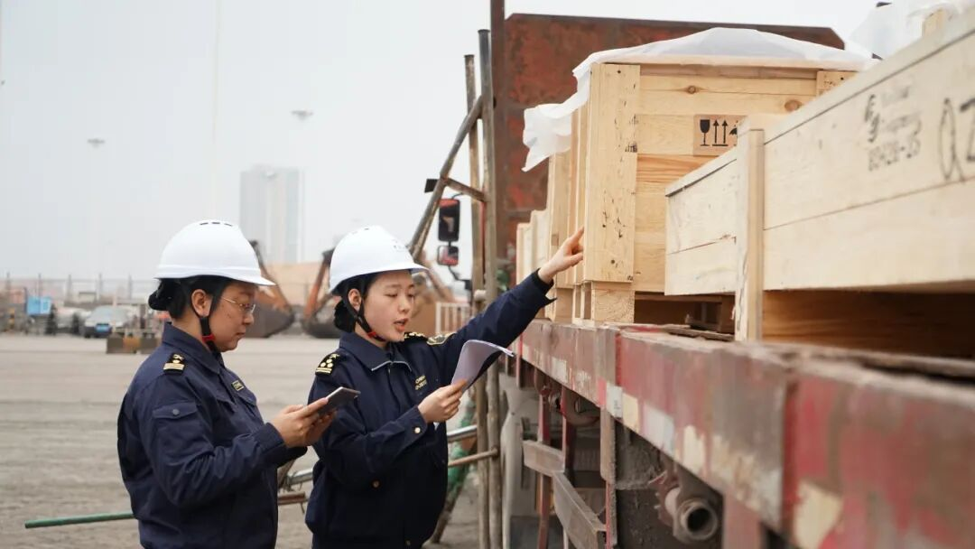 ↑钦州港海关关员范慧(左)和同事对进口大件设备进行现场监管。图源公众号@南宁海关发布
