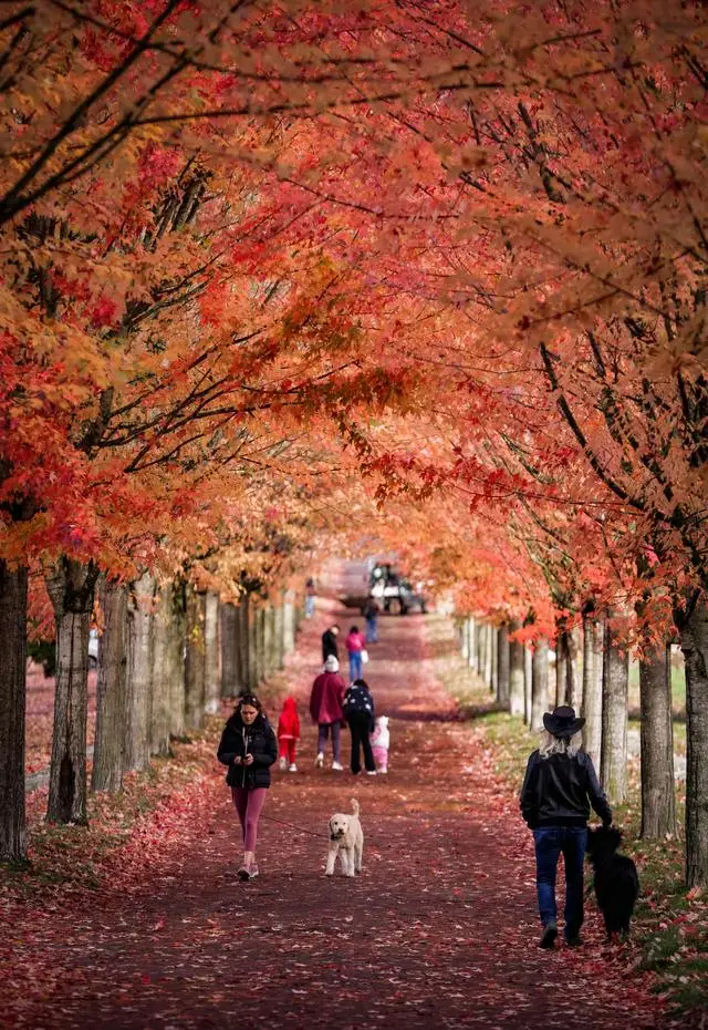 ▲在加拿大温哥华,人们走在秋色浓郁的树林间。图源@新华社发(梁森 摄)