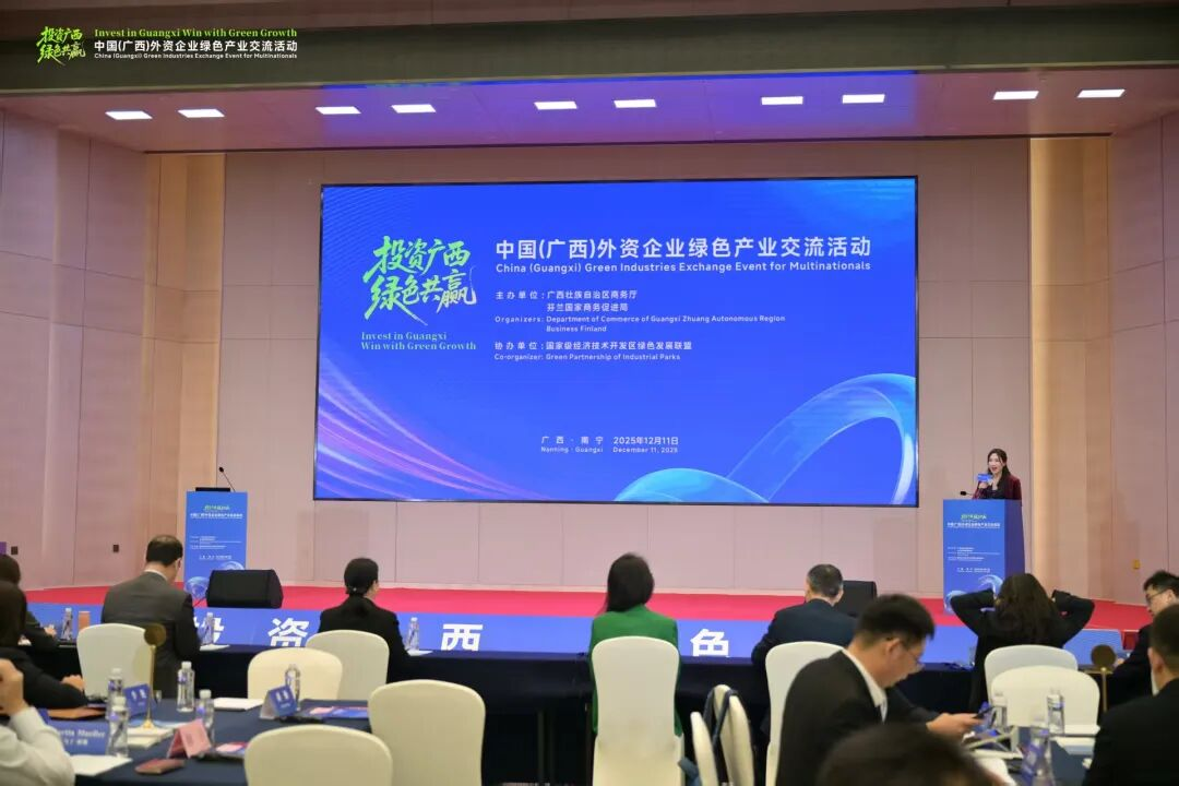 ↑2025年12月,中国(广西)外资企业绿色产业交流活动在南宁举行,来自芬兰、丹麦、法国、比利时、美国、瑞士、澳大利亚等国家的10余家外资企业和机构代表齐聚广西,搭建起中外企业、园区对接合作的高端平台,深化与欧盟国家绿色产业合作。