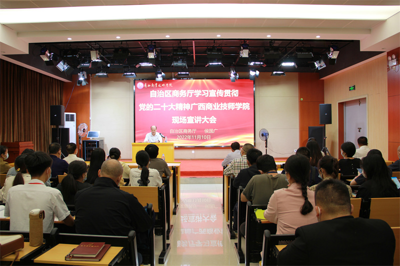 △11月10日,自治区商务厅一级巡视员侯国广来到广西商业技师学院宣讲党的二十大精神。