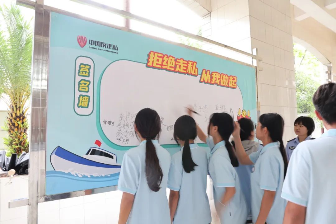学生们在“拒绝走私 从我做起”签名墙上郑重签名,承诺争做遵纪守法的新时代好青年。