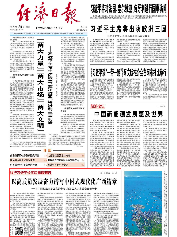 经济日报4月28日刊出《桂林画卷》深度调研报道,全面反映了广西壮族自治区牢记习近平总书记的嘱托,加快打造桂林世界级旅游城市,推进高质量发展的探索实践,产生热烈反响。