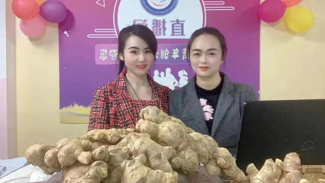 苏冠川(右一)在“青创直播间”为农户生姜直播带货。