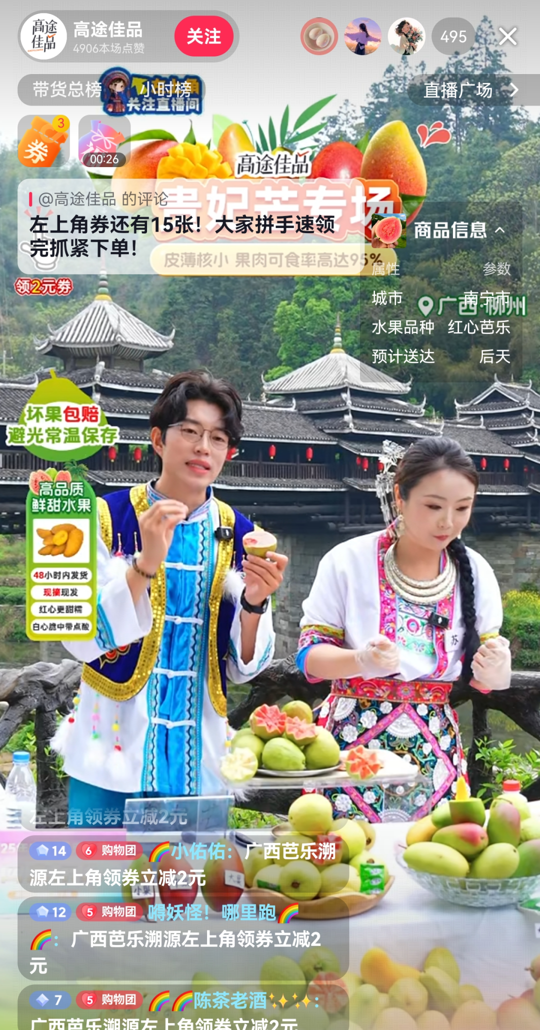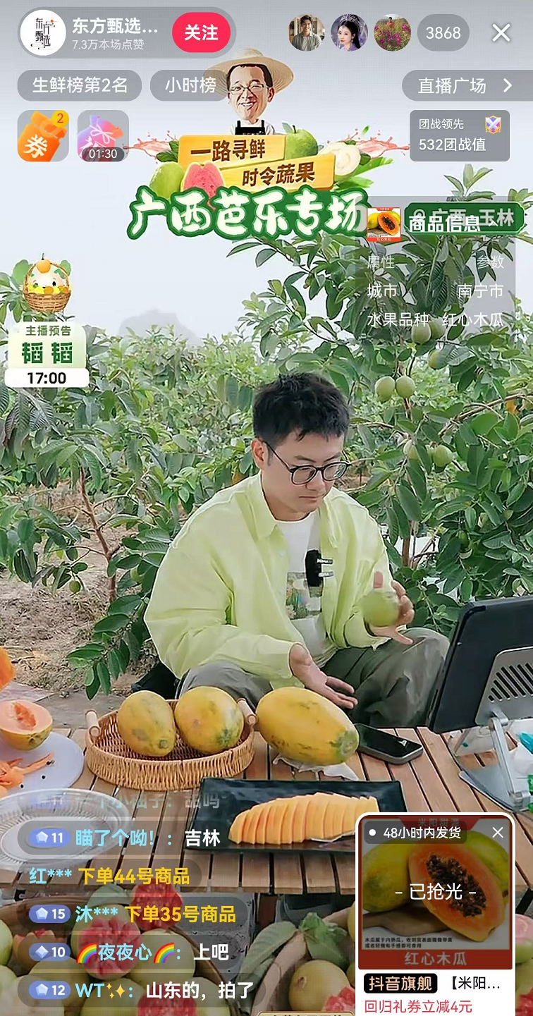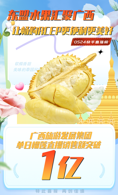 与辉同行、东方甄选等头部主播进行桂品带货直播,热销品含沃柑、芒果、芭乐、海鸭蛋、螺蛳粉等,以及泰国鲜榴莲、榴莲肉、越南咖啡等东盟特色产品;