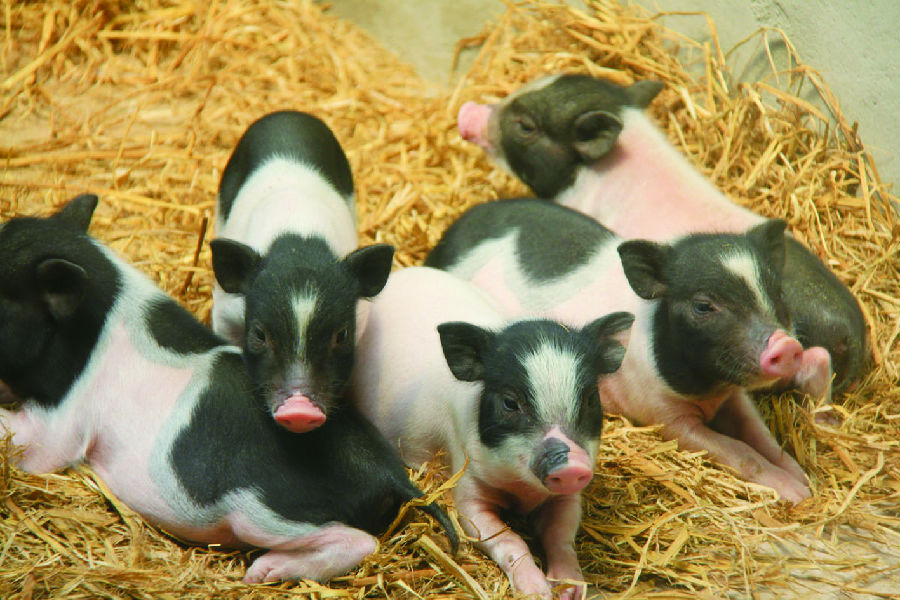 巴马香猪系野猪驯化而成。与普通猪相比,巴马香猪个体矮、小、短、圆,性野早熟,外貌颜色主要表现为两头黑、中间白,部分个体背腰部稍带黑斑,额头有白线或倒三角形白斑,因此在当地有“两头乌”“芭蕉猪”的俗称。未成年的小猪毛稀疏细,有光泽,皮肤红润细腻;成年后,猪毛较长,尤其是公猪,背毛和嘴粗长似野猪。