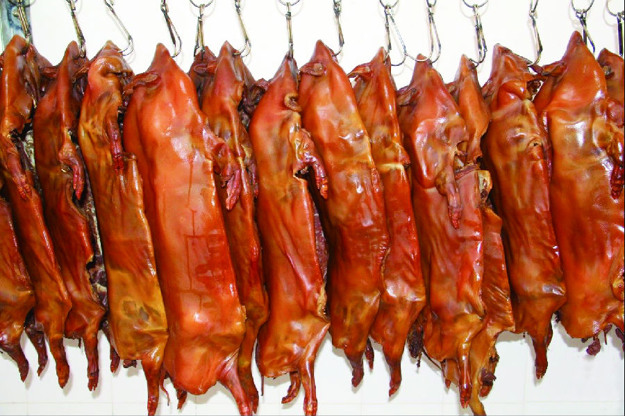 2. 上猪叉(用钢叉从后腿两旁肉里往前插至前腿,再用竹板把猪两面撑开),用开水烫猪皮,上皮色水(用麦芽糖,醋,水调制),自然风吹至皮干。