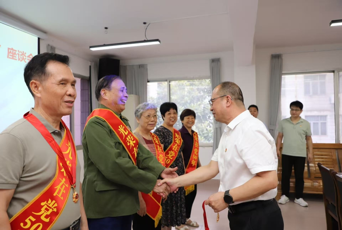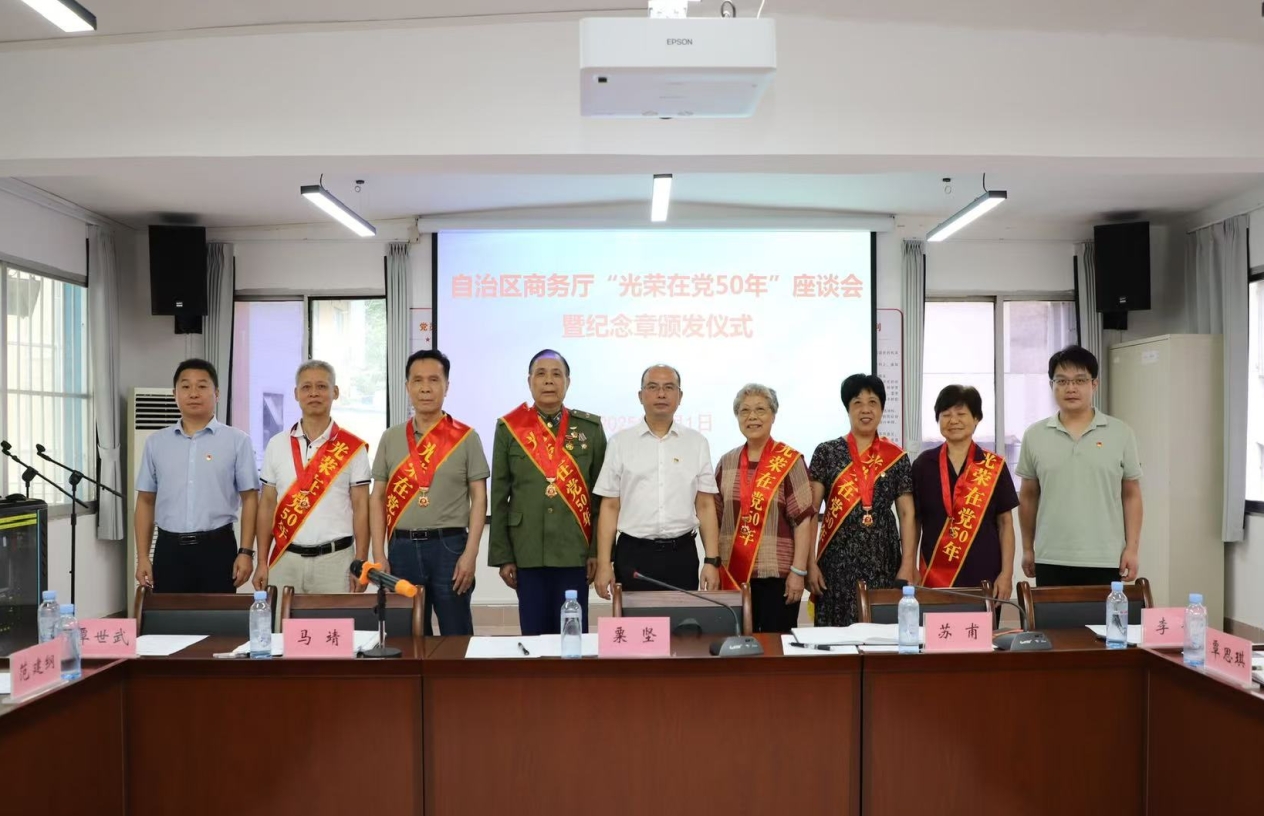 2025年7月1日,在中国共产党成立104周年之际,自治区商务厅隆重举行“光荣在党50年”座谈会暨纪念章颁发仪式。厅党组成员、副厅长,机关党委书记粟坚参加座谈会并为老党员颁发纪念章。