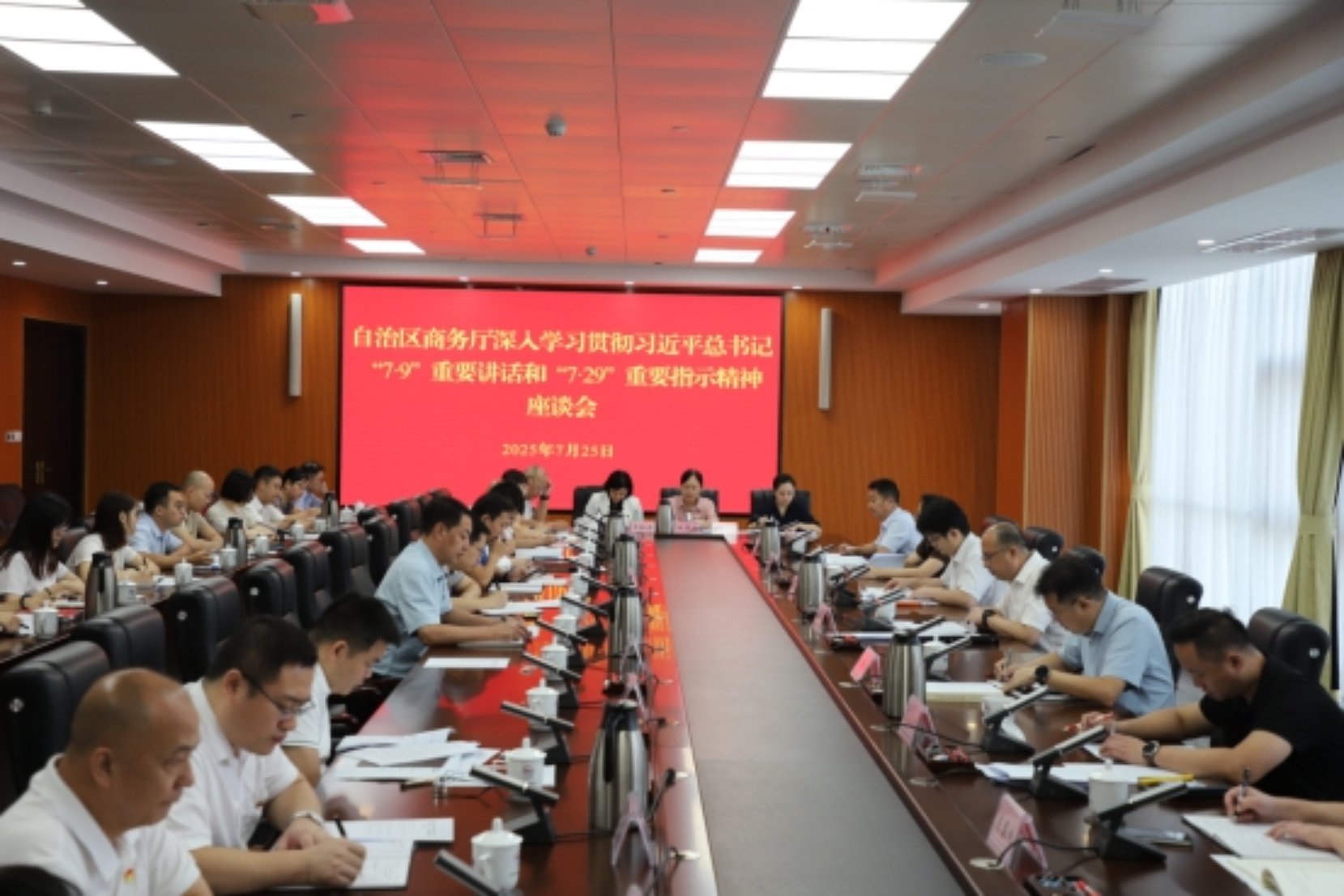 7月25日,自治区商务厅召开深入学习贯彻习近平总书记“7·9”重要讲话和“7·29”重要指示精神座谈会,自治区商务厅党组成员、副厅长、机关党委书记粟坚出席会议并讲话,机关党委委员和机关各处室、纪检组党支部书记和党务工作者参加。