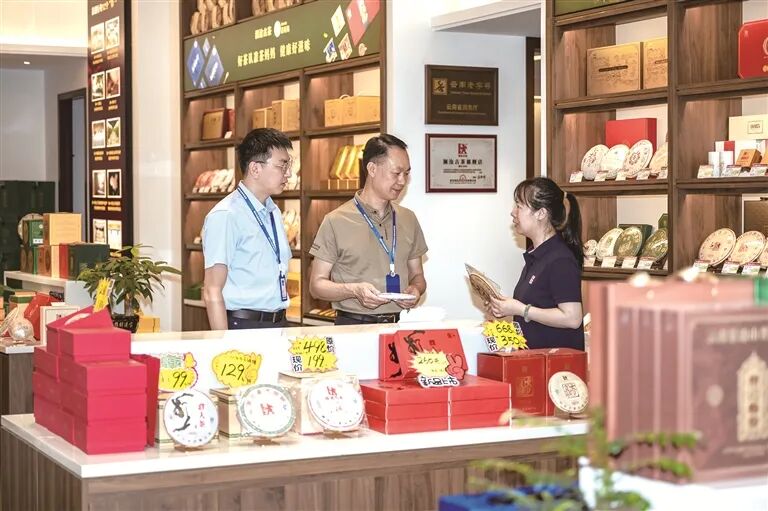广西壮族自治区柳州市纪委监委聚焦易发多发“四风”问题, 深挖违规公款购买名贵特产、购物卡,违规吃请等问题。图为近日,该市纪检监察干部到某茶叶店了解相关情况。覃智锋 摄