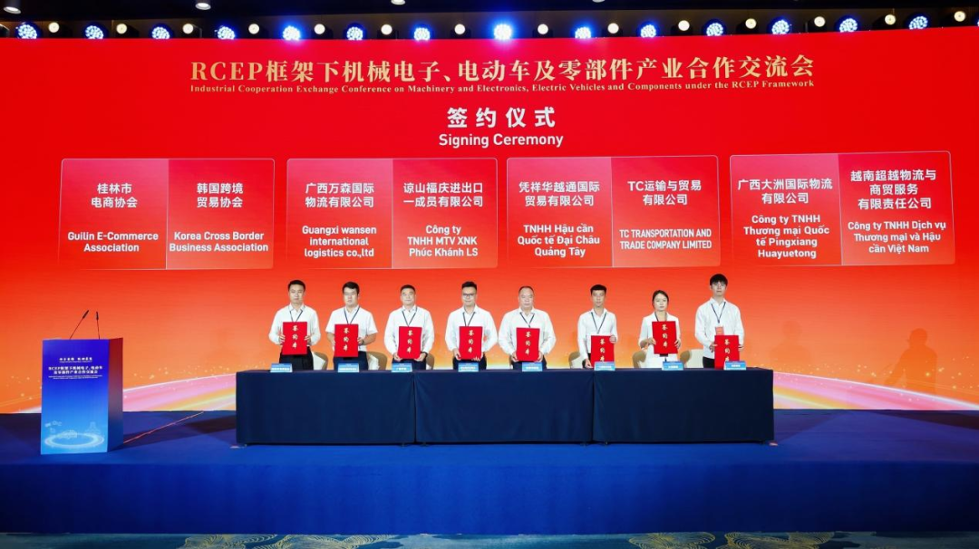 交流会现场,多项合作签约成为亮点。韩国跨境贸易协会与桂林市电商协会签署合作协议,将为中韩企业搭建常态化对接平台;广西万森国际物流、凭祥华越通国际物流等企业分别与越南合作伙伴签署跨境运输及机电设备采购协议,进一步畅通 “广西制造” 出海物流通道。
