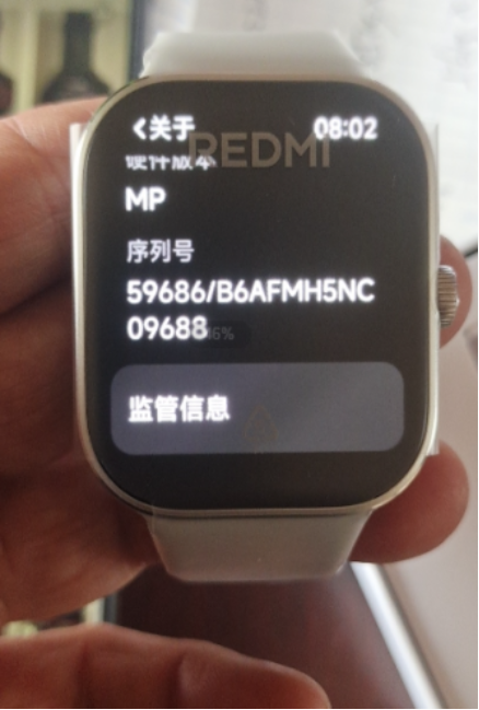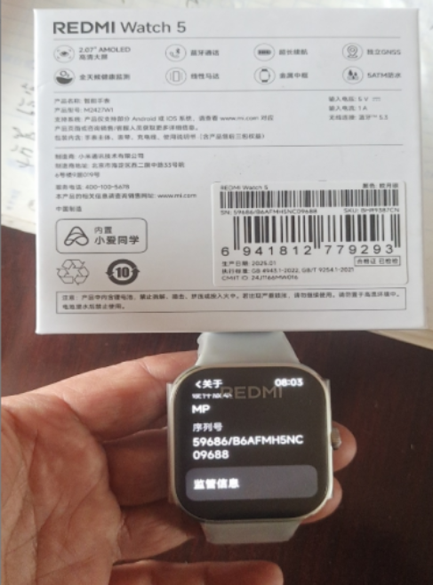 上传相关智能手表(手环)3张照片:第一张是商品包装盒上显示SN码的照片;第二张是智能穿戴设备屏幕开机SN的照片。第三张是商品包装盒SN码和智能穿戴设备开机SN的照片。(详见以下例图)