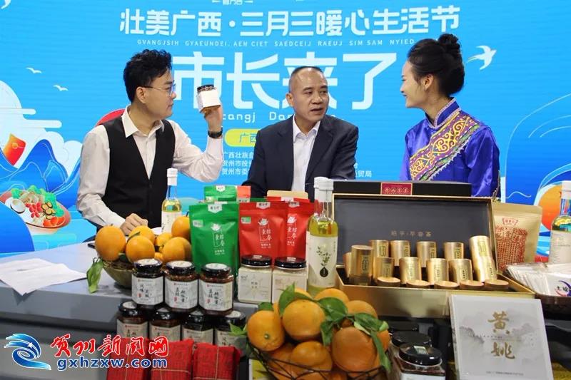 副市长覃志东在直播间里介绍到,贺州地处桂、粤、湘三省(区)结合部,属亚热带季风性湿润气候区,气候宜人、光热充足、雨量丰沛,土壤富含硒元素,是钟灵毓秀、物产富庶的果蔬之乡,素有“粤港澳后花园”、“粤港澳菜篮子、果篮子、肉篮子”之美誉,先后获得中国脐橙之乡、李子之乡、名茶之乡、马蹄之乡、世界长寿市等称号。