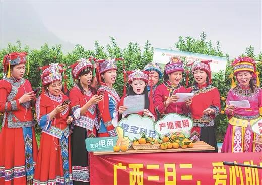 “三月三”期间,在罗城仫佬族自治县东门镇上四方屯沃柑基地,“仫佬家园”社区第一书记电商团队正在帮助果农在线上销售水果。廖光福 覃良东/摄