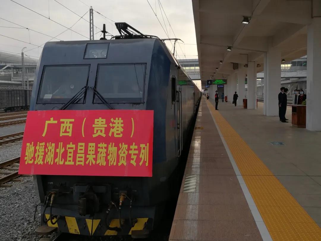 万众一心、同舟共济。在新冠疫情防控最吃劲的关键阶段,2月25日上午,满载200吨果蔬的第八班广西支援湖北果蔬物资直达冷链专列,从广西贵港站启程,直发湖北宜昌市。这是广西贵港市首次以专列形式组织物资驰援湖北,承载着500多万贵港人民对湖北人民的深情厚谊,也是广西第二次支援湖北宜昌市。专列预计2月26日中午到达宜昌市。