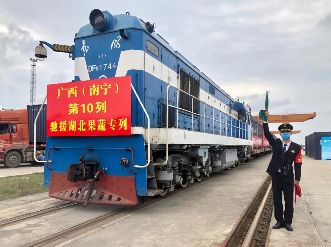 首班专列29日晚上11点发布产品集结令,到30日下午5点装车,采摘、分拣、包装、运输、集结等仅用了18个小时,满载200多吨的西红柿、西葫芦、辣椒、包菜、莴笋、竹筒青菜、毛节瓜、海鸭蛋等8种广西优质蔬菜、禽蛋的果蔬直达冷链专列,从南宁国际铁路港出发,直奔武汉市吴家山集装箱中心站。自治区商务厅、农业农村厅、南宁铁路局以及南宁市、贺州市、百色市和防城港市7厅市联动,企业和农户快速行动,确保了此次物资的快速集结。